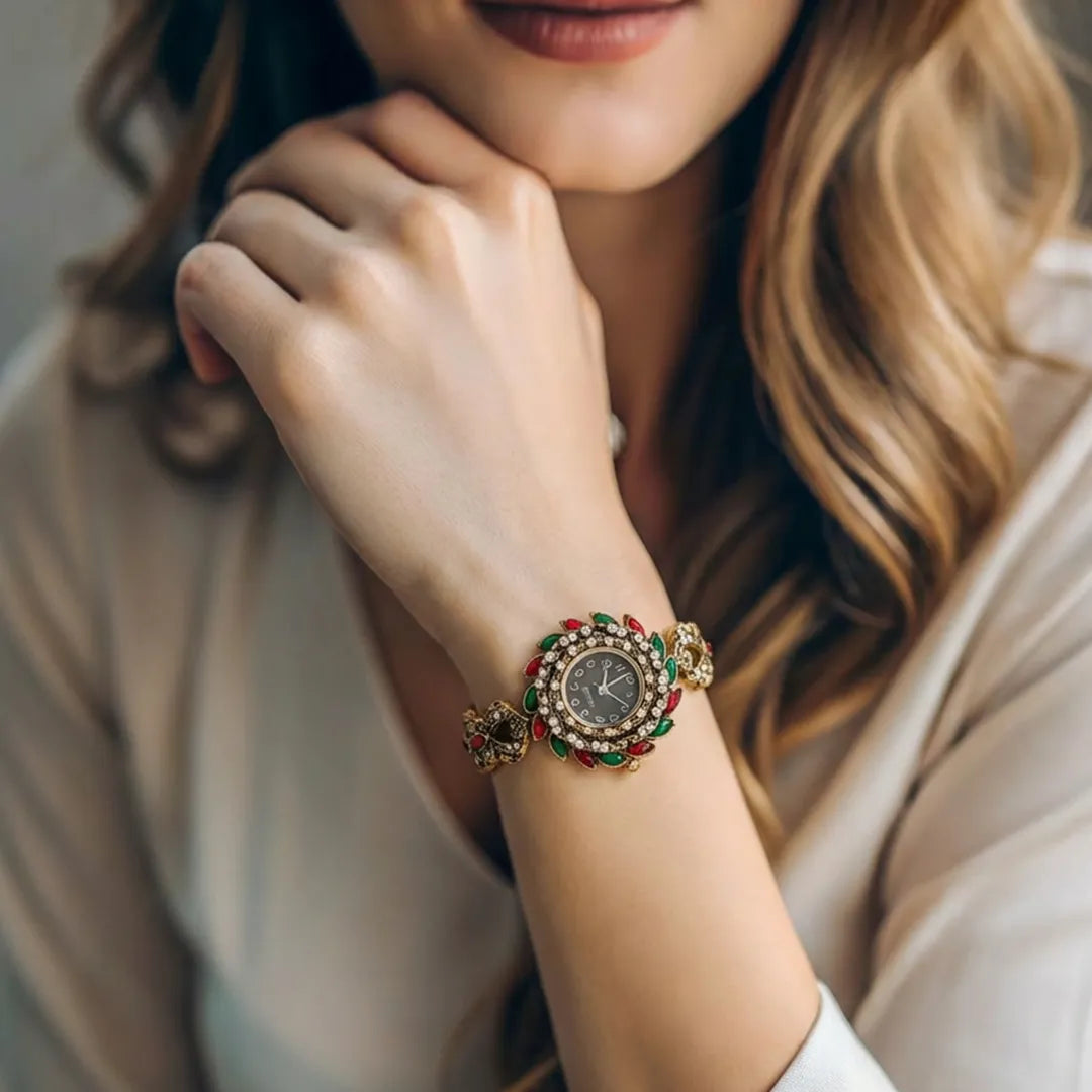Turkish Floral Stone Golden Watch | Luxurious Traditional Jewelry Timepiece